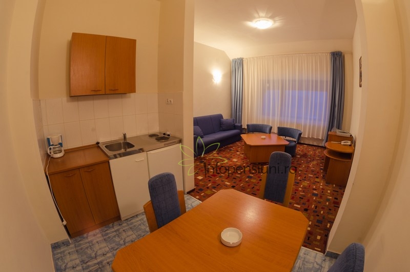 Hotelul dispune de 4 garsoniere si 20 de apartamente cu o dotare completa si moderna: mobilier intretinut, comod, cu un colorit armonizat cu decorul, minibucatarie si grup sanitar propriu fiecarei garsoniere, respectiv fiecarui apartament, televizor, cablu TV, telefon, minibar.